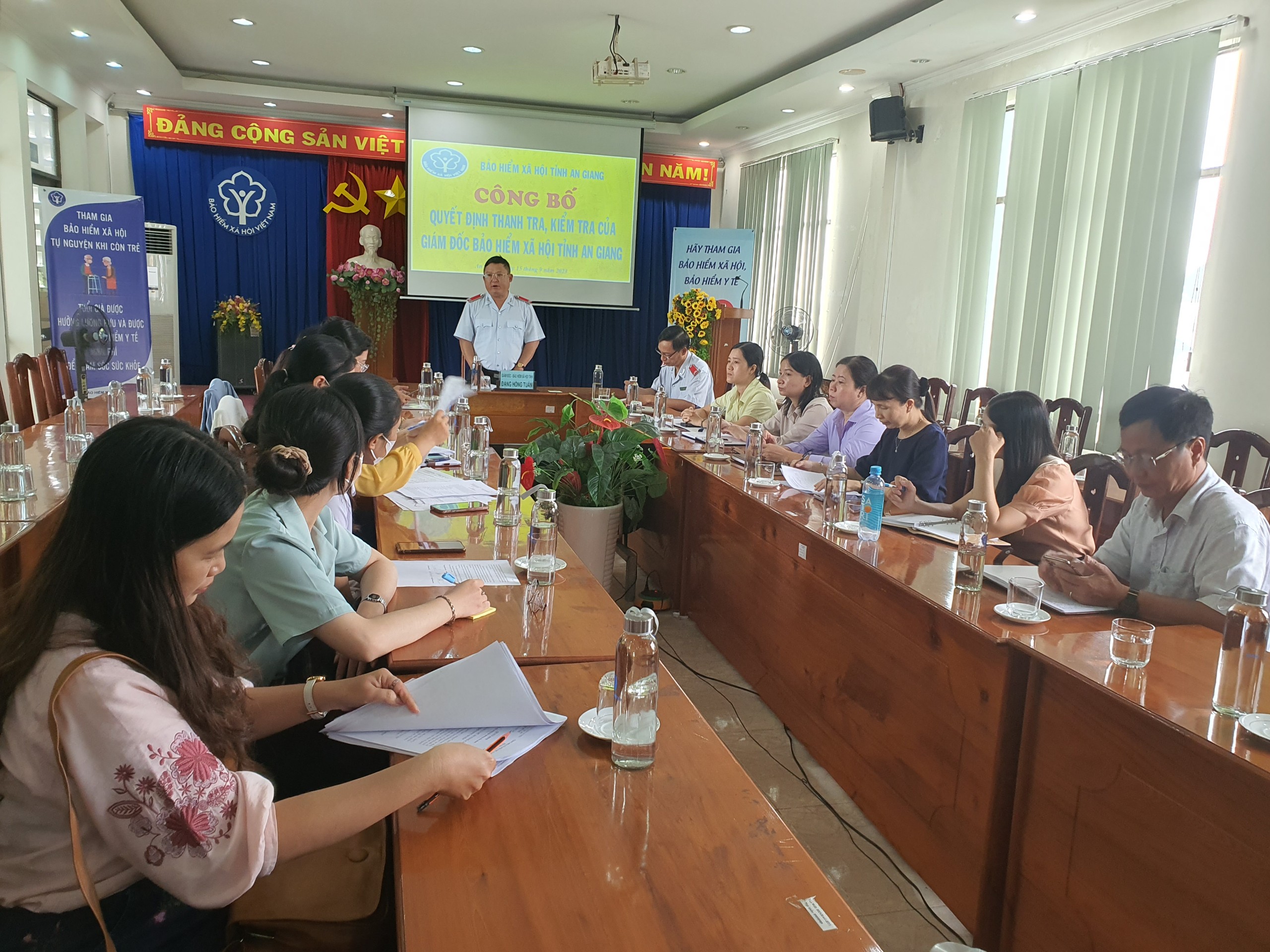 Sáng ngày 15/9, Bảo hiểm xã hội tỉnh An Giang tổ chức công bố Quyết định thanh tra, kiểm tra chuyên ngành đóng bảo hiểm xã hội (BHXH), bảo hiểm y tế (BHYT), bảo hiểm thất nghiệp (BHTN) tại các đơn vị sử dụng lao động trên địa bàn tỉnh. Ông Đặng Hồng Tuấn, Giám đốc Bảo hiểm xã hội tỉnh An Giang chủ trì buổi công bố.