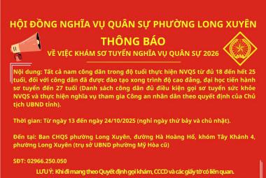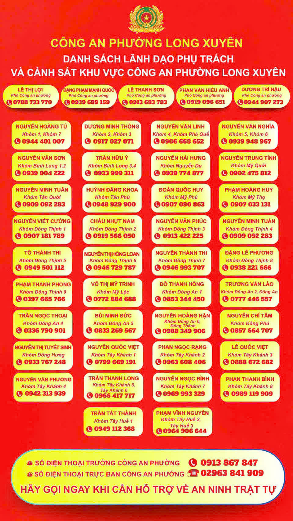 Danh sách Lãnh đạo phụ trách và cảnh sát khu vực công an phường Long Xuyên. Thông báo Thông tin tuyên truyền Thông tin cần biết 02/10/2025 - aA + /danh-sach-lanh-dao-phu-trach-va-canh-sat-khu-vuc-cong-phuong-long-xuyen Ban Biên tập Tin tức liên quan Thông báo về việc khám sơ tuyển nghĩa vụ quân sự 2026 của Hội đồng nghĩa vụ quân sự phường Long Xuyên Thông báo 07/10/2025 Hội đồng nghĩa vụ quân sự phường Long Xuyên thông báo về việc nộp chứng từ hiện học Thông báo 23/09/2025 Thông báo: Tuyển công dân thực hiện nghĩa vụ tham gia Công an nhân dân năm 2026 Thông báo 23/09/2025 THÔNG BÁO Về việc treo cờ Tổ quốc chào mừng Đại hội đại biểu Đảng bộ phường Long Xuyên lần thứ I, nhiệm kỳ 2025 - 2030 và Ngày hội toàn dân bảo vệ an ninh Tổ quốc năm 2025 Thông báo 06/08/2025 THÔNG BÁO: Về việc treo Quốc kỳ nhân dịp kỷ niệm 78 năm Ngày Thương binh - Liệt sĩ (27/7/1947 - 27/7/2025) Thông báo 17/07/2025 Quyết định về việc công bố danh mục thủ tục hành chính thực hiện tiếp nhận và không tiếp nhận tại Trung tâm Phục vụ hành chính công cấp xã và thực hiện không phụ thuộc vào địa giới hành chính trên địa bàn tỉnh An Giang Thông báo 15/07/2025