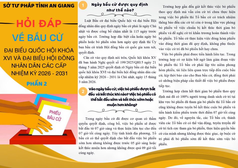 Hỏi - đáp về bầu cử đại biểu Quốc hội khóa XVI và đại biểu Hội đồng nhân dân các cấp nhiệm kỳ 2026 - 2031 BẦU CỬ ĐẠI BIỂU QUỐC HỘI KHÓA XVI VÀ HĐND CÁC CẤP NHIỆM KỲ 2026-2031 12/02/2026 - aA + /hoi-dap-ve-bau-cu-dai-bieu-quoc-hoi-khoa-xvi-va-dai-bieu-hoi-dong-nhan-dan-cac-cap-nhiem-ky-2026-0 Ban Biên tập Tin tức liên quan Hỏi - Đáp về bầu cử đại biểu Quốc hội khóa XVI và đại biểu Hội đồng nhân dân các cấp nhiệm kỳ 2026 - 2031 BẦU CỬ ĐẠI BIỂU QUỐC HỘI KHÓA XVI VÀ HĐND CÁC CẤP NHIỆM KỲ 2026-2031 12/02/2026 PHƯỜNG LONG XUYÊN HOÀN THÀNH HỘI NGHỊ LẤY Ý KIẾN NHẬN XÉT VÀ TÍN NHIỆM CỦA CỬ TRI NƠI CƯ TRÚ ĐỐI VỚI NHỮNG NGƯỜI ỨNG CỬ ĐẠI BIỂU QUỐC HỘI KHÓA XVI VÀ ĐẠI BIỂU HĐND CÁC CẤP, NHIỆM KỲ 2026 – 2031 BẦU CỬ ĐẠI BIỂU QUỐC HỘI KHÓA XVI VÀ HĐND CÁC CẤP NHIỆM KỲ 2026-2031 07/02/2026 Hội nghị lấy ý kiến nhận xét và tín nhiệm của cử tri nơi cư trú đối với người ứng cử đại biểu Quốc hội khóa XVI và đại biểu HĐND các cấp, nhiệm kỳ 2026 - 2031 BẦU CỬ ĐẠI BIỂU QUỐC HỘI KHÓA XVI VÀ HĐND CÁC CẤP NHIỆM KỲ 2026-2031 06/02/2026 KHÓM TÂN QUỚI TỔ CHỨC TRAO 60 PHẦN QUÀ TẾT CHO HỘ CẬN NGHÈO, HỘ KHÓ KHĂN BẦU CỬ ĐẠI BIỂU QUỐC HỘI KHÓA XVI VÀ HĐND CÁC CẤP NHIỆM KỲ 2026-2031 06/02/2026 QUY TRÌNH HIỆP THƯƠNG, GIỚI THIỆU NGƯỜI ỨNG CỬ ĐẠI BIỂU QUỐC HỘI KHÓA XVI & ĐẠI BIỂU HĐND CÁC CẤP (NHIỆM KỲ 2026 - 2031) BẦU CỬ ĐẠI BIỂU QUỐC HỘI KHÓA XVI VÀ HĐND CÁC CẤP NHIỆM KỲ 2026-2031 06/02/2026 Hội nghị hiệp thương lần thứ 2 để thỏa thuận lập danh sách sơ bộ những người ứng cử đại biểu HĐND phường nhiệm kỳ 2026-2031 BẦU CỬ ĐẠI BIỂU QUỐC HỘI KHÓA XVI VÀ HĐND CÁC CẤP NHIỆM KỲ 2026-2031 02/02/2026