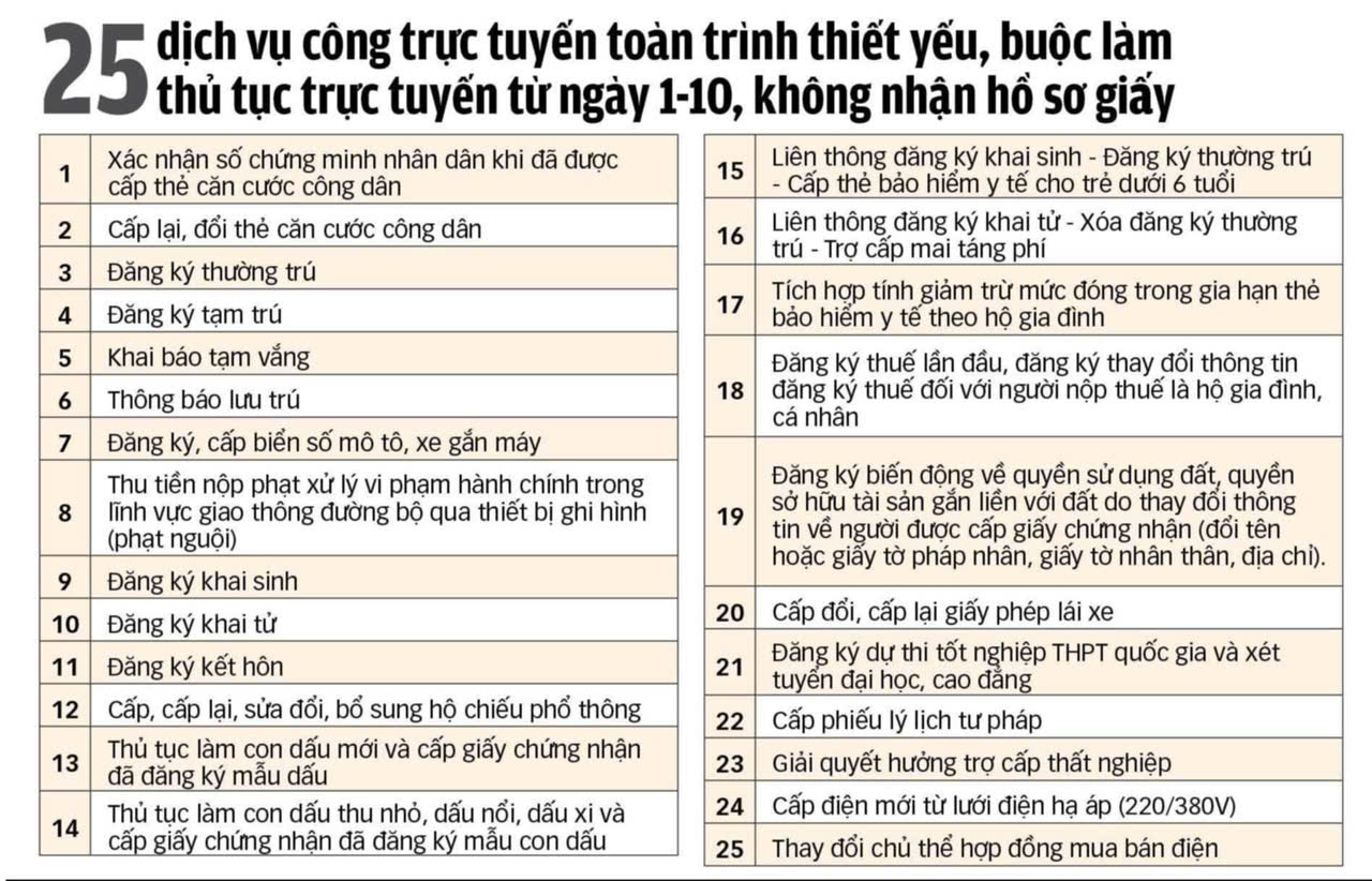 Từ ngày 1-10-2025, các Trung tâm Phục vụ hành chính công trên cả nước sẽ ngừng tiếp nhận hồ sơ giấy đối với 25 dịch vụ công thiết yếu. Người dân sẽ được giải quyết thủ tục hành chính trực tuyến hoàn toàn giúp tiết kiệm thời gian và chi phí.