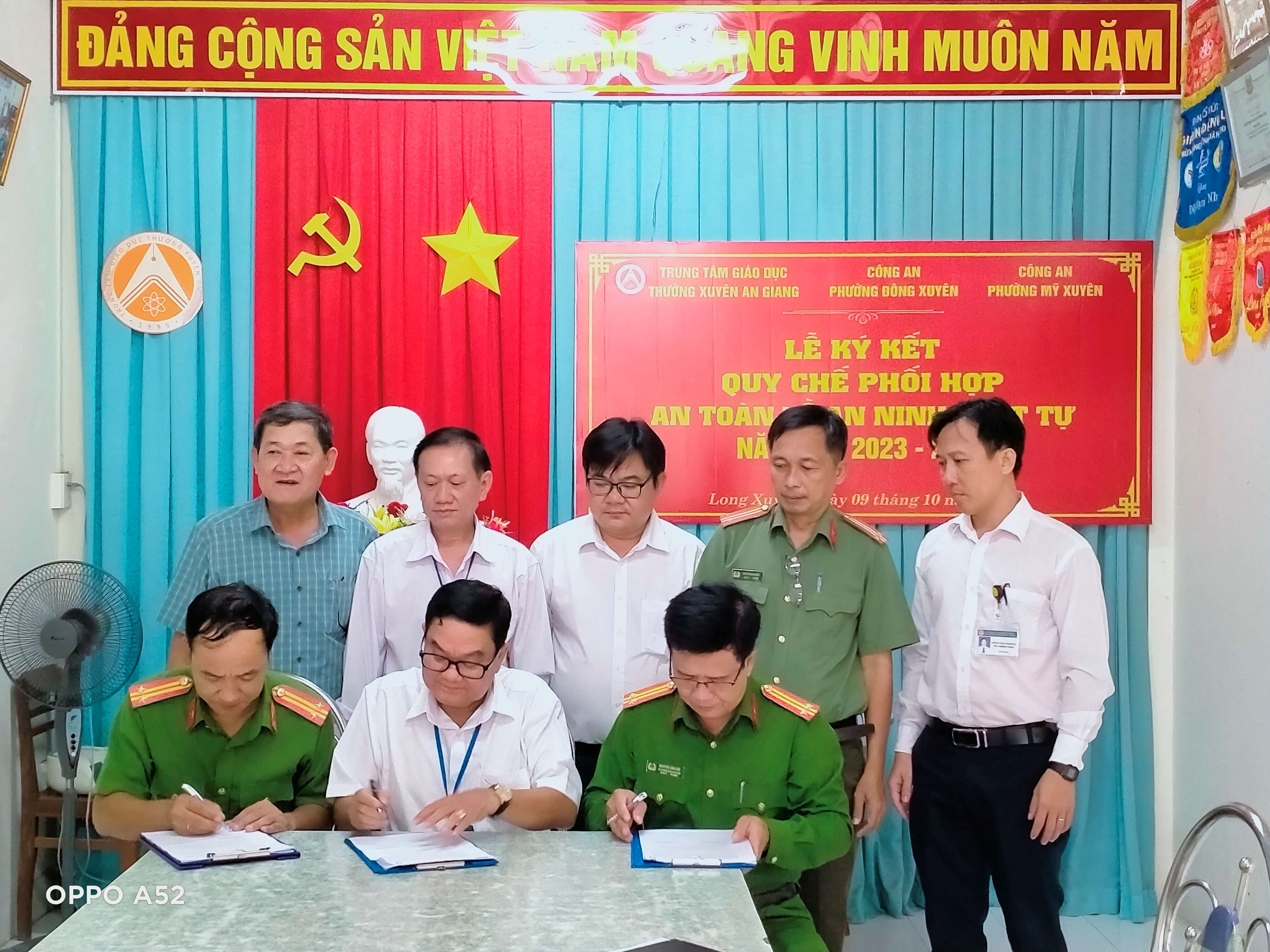 Sáng ngày 9/10, Trung tâm GDTX An Giang phối hợp Công an 2 phường Mỹ Xuyên và Đông Xuyên, TP. Long Xuyên tổ chức Lễ ký kết Quy chế phối hợp đảm bảo về an toàn an ninh trật tự năm học 2023 - 2024.