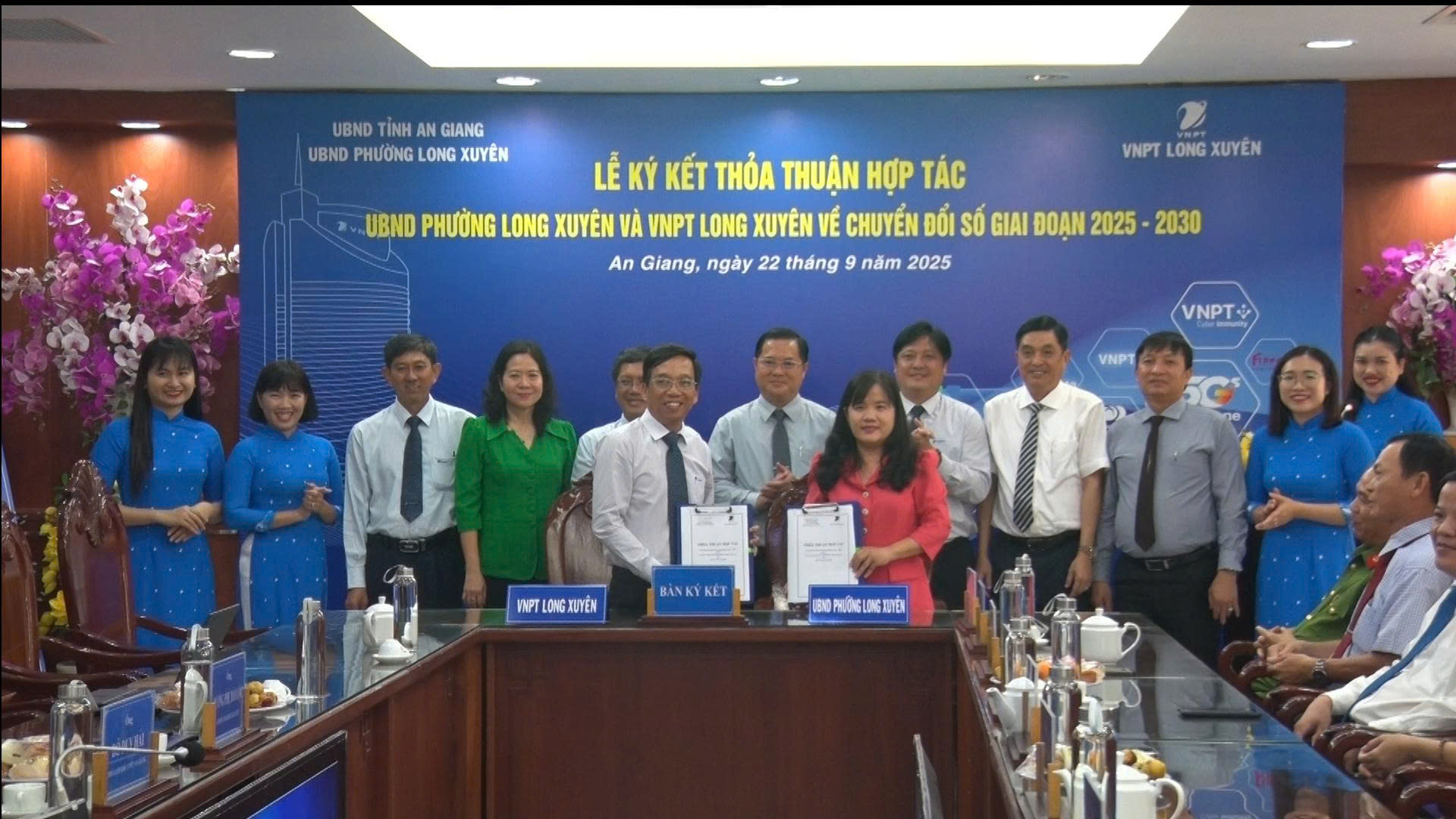 Chiều ngày 22/9, UBND phường Long Xuyên phối hợp cùng VNPT Long Xuyên tổ chức Lễ ký kết thoả thuận hợp tác chuyển đổi số giai đoạn 2025 – 2030 và ra mắt Trung tâm điều hành thông minh phường Long Xuyên. Đồng chí Huỳnh Quốc Thái, UVTV Tỉnh ủy, Bí thư Đảng ủy, Chủ tịch HĐND phường Long Xuyên; đồng chí Võ Thị Xuân Kiều - Phó Bí thư Thường trực Đảng ủy phường; đồng chí Đoàn Thị Hương Hà, Phó Bí thư Đảng ủy, Chủ tịch UBND phường; Ông Đỗ Duy Hải, Phó Giám đốc VNPT An Giang; Ông Nguyễn Hưng, Giám đốc VNPT Long Xuyên cùng tham dự.
