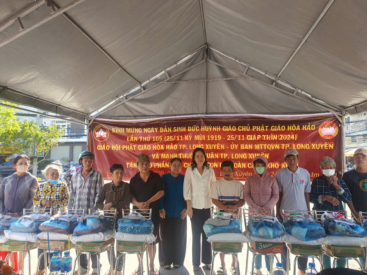Sáng ngày 24/12, Ủy ban MTTQVN TP.Long Xuyên phối hợp Ban đại diện Phật giáo Hòa Hảo thành phố tổ chức trao 400 phần quà cho bà con có hoàn cảnh khó khăn trên địa bàn thành phố. Đến dự có bà Võ Thị Xuân Kiều, Phó Chủ tịch UBND thành phố, ông Nguyễn Thanh Quang, Chủ tịch UBMTTQVN thành phố.