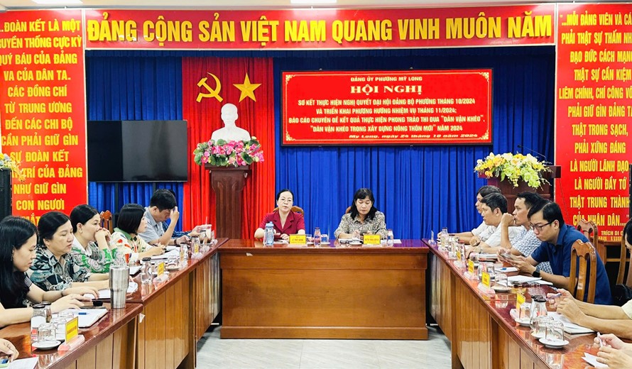 Trong tháng 10/2024, Đảng bộ phường Mỹ Long thực hiện và tổ chức các hoạt động như: Thăm và chúc thọ Người cao tuổi nhân ngày Quốc tế Người cao tuổi (01/10); họp mặt kỷ niệm Ngày truyền thống công tác Dân vận của Đảng (15/10). Công tác Xây dựng đảng, xây dựng hệ thống chính trị được quan tâm chỉ đạo, tạo quyết tâm chính trị, sự đồng thuận trong Đảng bộ; quản lý nhà nước tiếp tục có những chuyển biến tích cực nhất là về công tác lập lại trật tự đô thị, thu chi ngân sách; an ninh chính trị, trật tự an toàn xã hội, trật tự đô thị trên địa bàn phường được giữ vững. Tại hội nghị cũng đã sơ kết kết quả thực hiện phong trào thi đua “Dân vận khéo” năm 2024 với nhiều kết quả tích cực và nhân rộng nhiều mô hình, điển hình, cách làm hay, hiệu quả trên các lĩnh vực của đời sống xã hội.