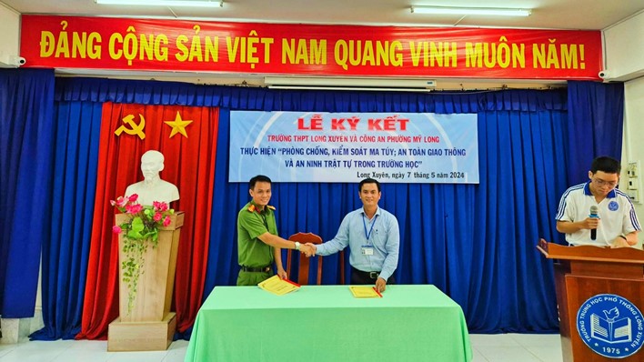 Thực hiện kế hoạch liên ngành số 404/KHLN ngày 18/11/1996 của Công an Tỉnh - Sở Giáo dục & Đào tạo - Sở LĐTBXH - Sở Y Tế - Đoàn TNCS Hồ Chí Minh tỉnh An Giang - Hội LHPN tỉnh An Giang, sáng ngày 07/5/2024 trường THPT Long Xuyên và Công an phường Mỹ Long tổ chức lễ ký kết giao ước thực hiện công tác phòng chống, kiểm soát ma túy; an toàn giao thông và an ninh trật tự trong trường học. Tham dự lễ ký kết có Ban Giám hiệu trường và lãnh đạo Công an phường Mỹ Long, cùng học sinh trường THPT Long Xuyên tham dự.