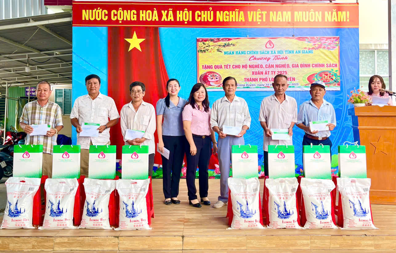 Nhân dịp tết Nguyên đán Ất Tỵ 2025, Ngân hàng CSXH Chi nhánh tỉnh An Giang đã trao tặng 30 xuất quà Tết cho hộ nghèo, hộ cận nghèo, gia đình chính sách của 2 phường Mỹ Thới và Mỹ Thạnh với tổng trị giá 15 triệu đồng. Những phần quà là tấm lòng, tình cảm của cán bộ, viên chức, người lao động Ngân hàng CSXH gửi đến người dân, với mong muốn được chia sẻ một phần khó khăn để bà con đón Tết vui tươi, đầm ấm. Mong muốn các hộ tiếp tục nỗ lực, đoàn kết, phấn đấu vươn lên xây dựng cuộc sống ngày càng ấm no, hạnh phúc./.