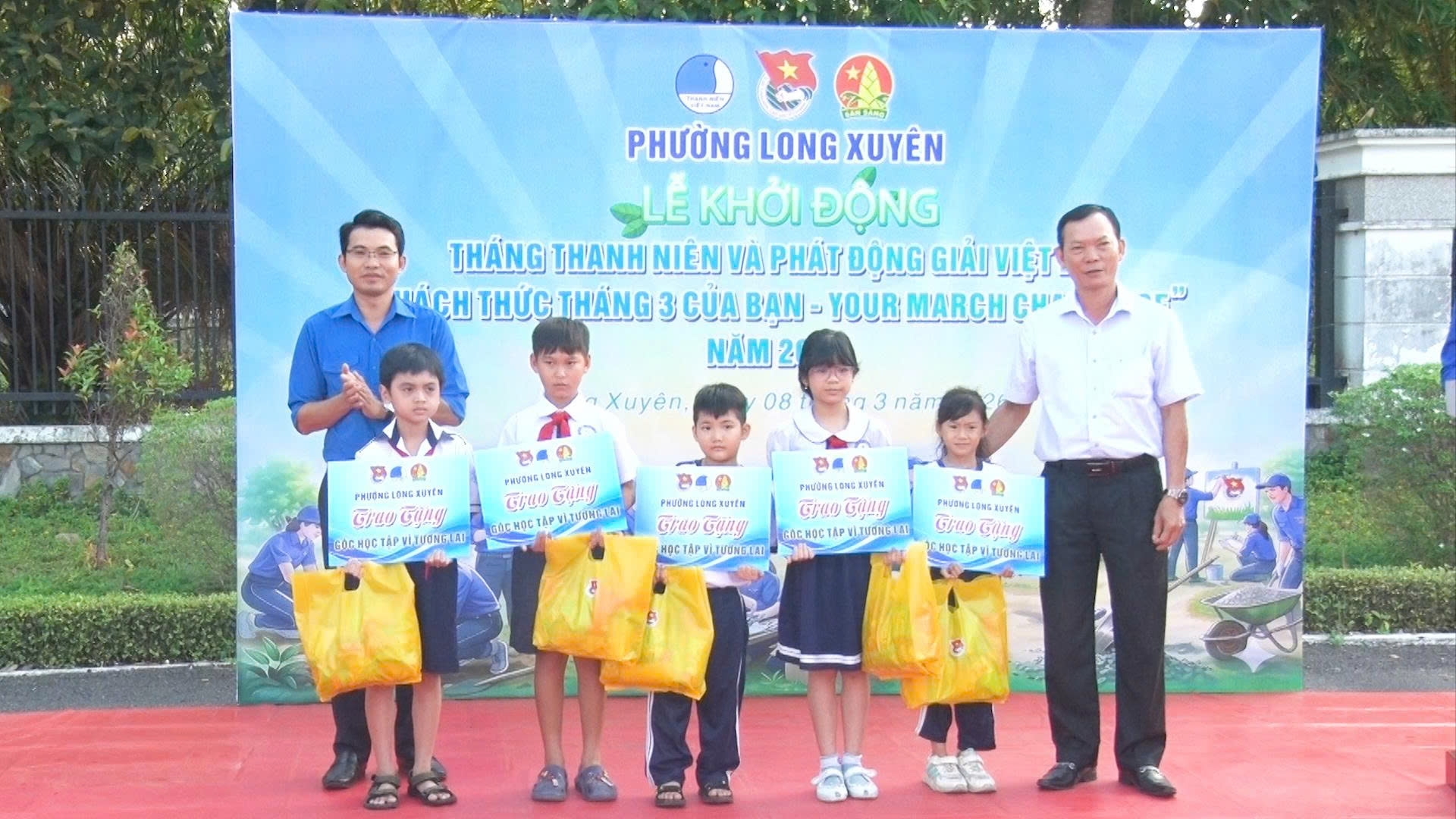 Ngay sau Lễ khởi động, các bạn đoàn viên, thanh niên và học sinh các trường THPT trên địa bàn phường Long Xuyên đã tham gia giải chạy Việt Dã “Thách thức tháng 3 của bạn năm 2026”; đồng thời, ra quân thực hiện công trình “Tuyến đường thanh niên sáng – xanh – sạch – đẹp” với các hoạt động như: Trao ảnh Bác; trao Cờ Tổ quốc kết hợp phát tờ rơi tuyên truyền nâng cao nhận thức của người dân trong việc phân loại rác tại nguồn, chung tay vì môi trường xanh – sạch – đẹp; cảnh giác lừa đảo trên không gian mạng; cách nhận biết và phòng ngừa ma túy học đường…. tại tuyến đường Phan Liêm, Khóm Đông An 1, với tổng kinh phí 10 triệu đồng, do Đoàn cơ sở Agribank chi nhánh An Giang trao tặng. Dịp này, Hội đồng đội phường cũng đã trao 06 góc học tập cho các em học sinh vượt khó, học tốt trường Tiểu học Châu Văn Liêm và Trường Tiểu học Nguyễn Khuyến, động viên các em nỗ lực vươn lên trong học tập, trở thành con ngoan trò giỏi, cháu ngoan Bác Hồ.