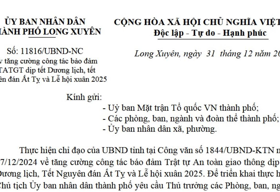 Ủy ban nhân dân thành phố Long Xuyên ban hành Công văn số 11816/UBND-NC, ngày 31/12/2024 về việc tăng cường công tác bảo đảm TTATGT dịp tết Dương lịch, tết Nguyên đán Ất Tỵ và Lễ hội xuân 2025