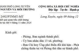 Phòng Tài nguyên và môi trường thành phố Long Xuyên ban hành công văn số 2492/PTNMT-MT, ngày 09/12/2024 về việc thông báo kết quả quan trắc chất lượng nước mặt liên tục đợt 4 tháng 11 năm 2024