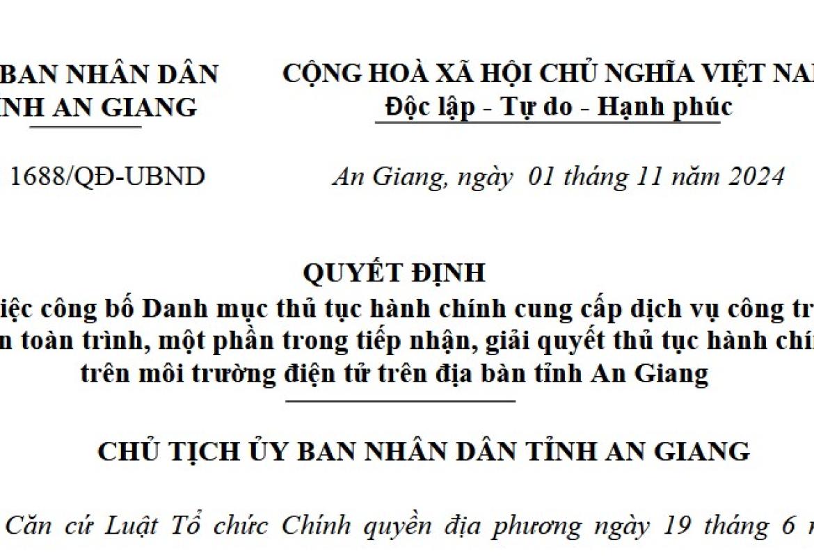 Ủy ban nhân dân tỉnh An Giang ban hành Quyết định số 1688/QĐ-UBND, ngày 01/11/2024 về việc công bố Danh mục thủ tục hành chính cung cấp dịch vụ công trực tuyến toàn trình, một phần trong tiếp nhận, giải quyết thủ tục hành chính trên môi trường điện tử trên địa bàn tỉnh An Giang