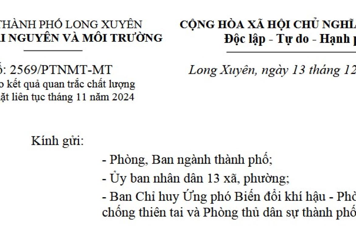 Phòng Tài nguyên môi trường thành phố Long Xuyên ban hành công văn số 2569/PTNMT-MT, ngày 13/12/2024 về việc thông báo kết quả quan trắc chất lượng nước mặt liên tục tháng 11 năm 2024