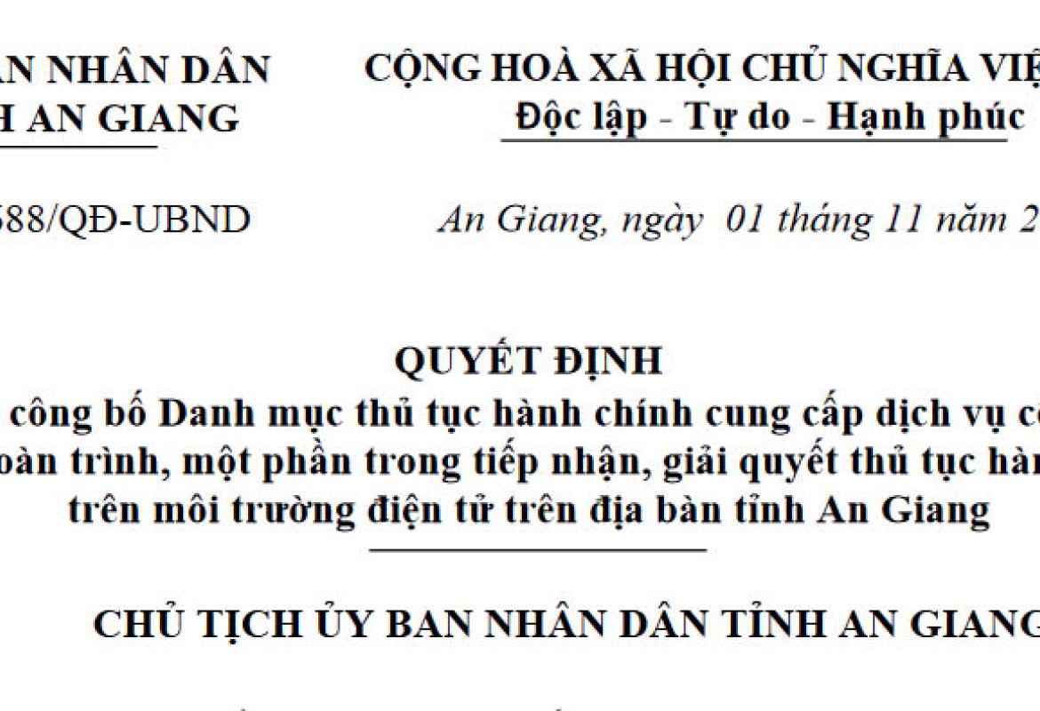 Ủy ban nhân dân tỉnh An Giang ban hành Quyết định về việc công bố danh mục thủ tục hành chính cung cấp dịch vụ công trực tuyến toàn trình, một phần trong tiếp nhận, giải quyết thủ tục hành chính trên môi trường điện tử trên địa bàn tỉnh An Giang