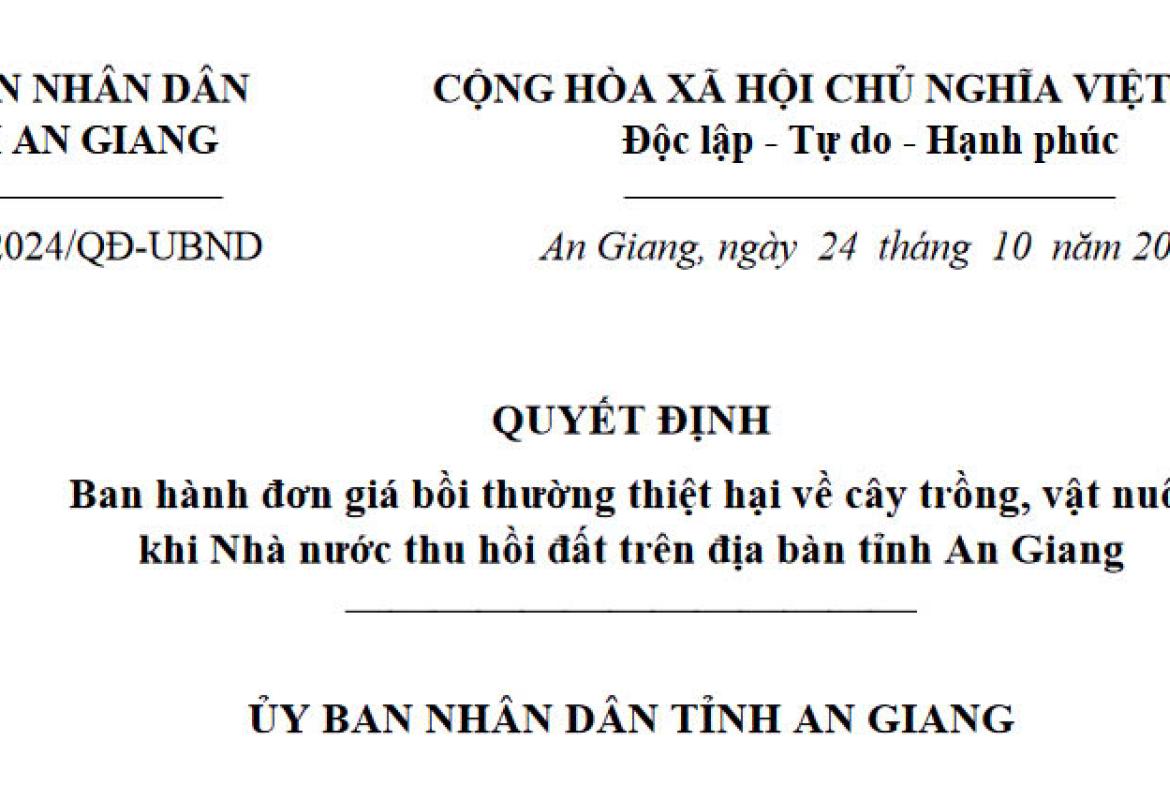 Ủy ban nhân dân tỉnh An Giang ban hành Quyết định số 52/2024/QĐ-UBND, ngày 24/10/2024 Ban hành đơn giá bồi thường thiệt hại về cây trồng, vật nuôi khi nhà nước thu hồi đất trên địa bàn tỉnh An Giang