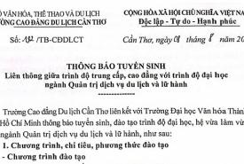 Trường cao đẳng Du lịch Cần Thơ ban hành Thông báo số 192/TB-CĐDLCT tuyển sinh liên thông giữa trình độ trung cấp, ca