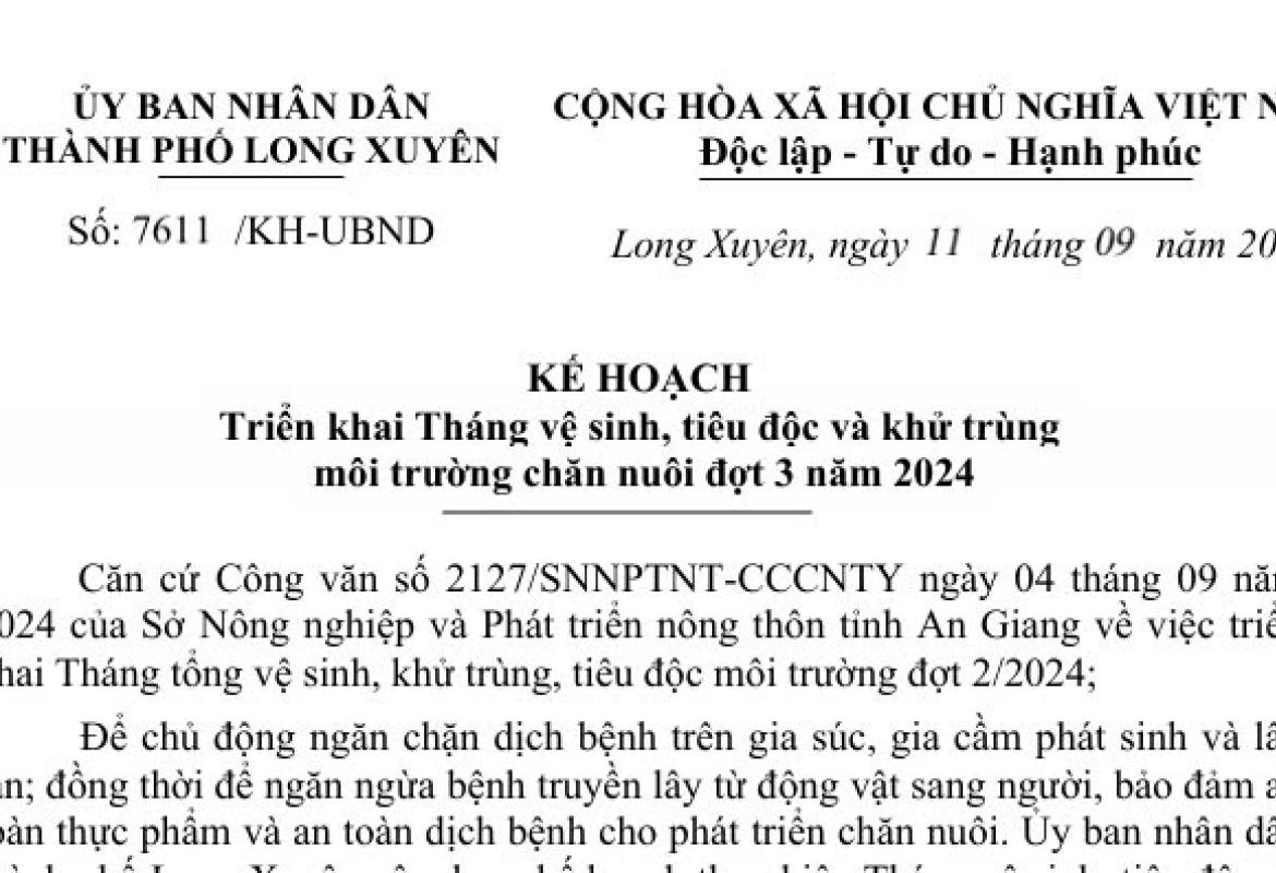 Ủy ban nhân dân thành phố Long Xuyên ban hành Kế hoạch số 7611/KH-UBND, ngày 11/9/2024 triển khai Tháng vệ sinh, tiêu độc và khử trùng môi trường chăn nuôi đợt 3 năm 2024