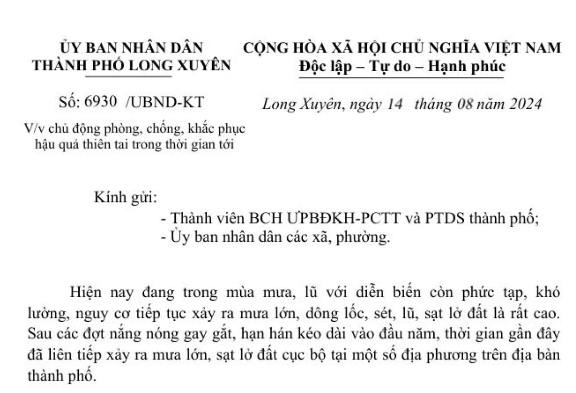 Ủy ban nhân dân thành phố Long Xuyên ban hành công văn số 6930/UBND-KT về việc chủ động phòng, chống,khắc phục hậu qu