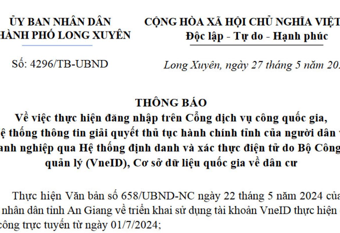 UBND thành phố Long Xuyên ban hành Thông báo số 4296/TB-UBND, ngày 27/5/2024 về việc thực hiện đăng nhập trên Cổng dị
