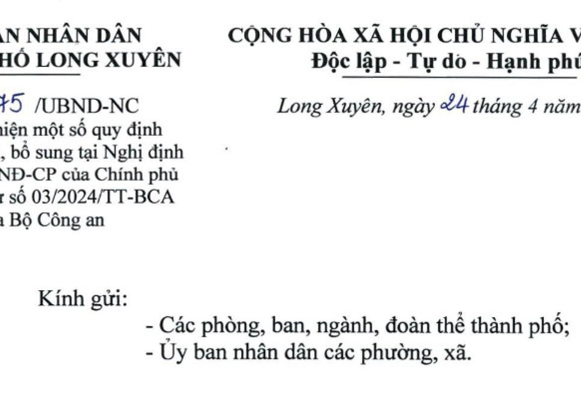 UBND thành phố Long Xuyên ban hành Công văn số 3375/UBND-NC về việc thực hiện một số quy định được sửa đổi, bổ sung tại Nghị định số 56/2023/NĐ-CP của Chính phủ và Thông tư số 03/2024/TT-BCA của Bộ Công an