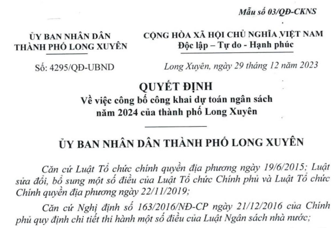 Ủy ban nhân dân thành phố Long Xuyên ban hành Quyết định về việc công bố công khai dự toán ngân sách năm 2024 của thành phố Long Xuyên