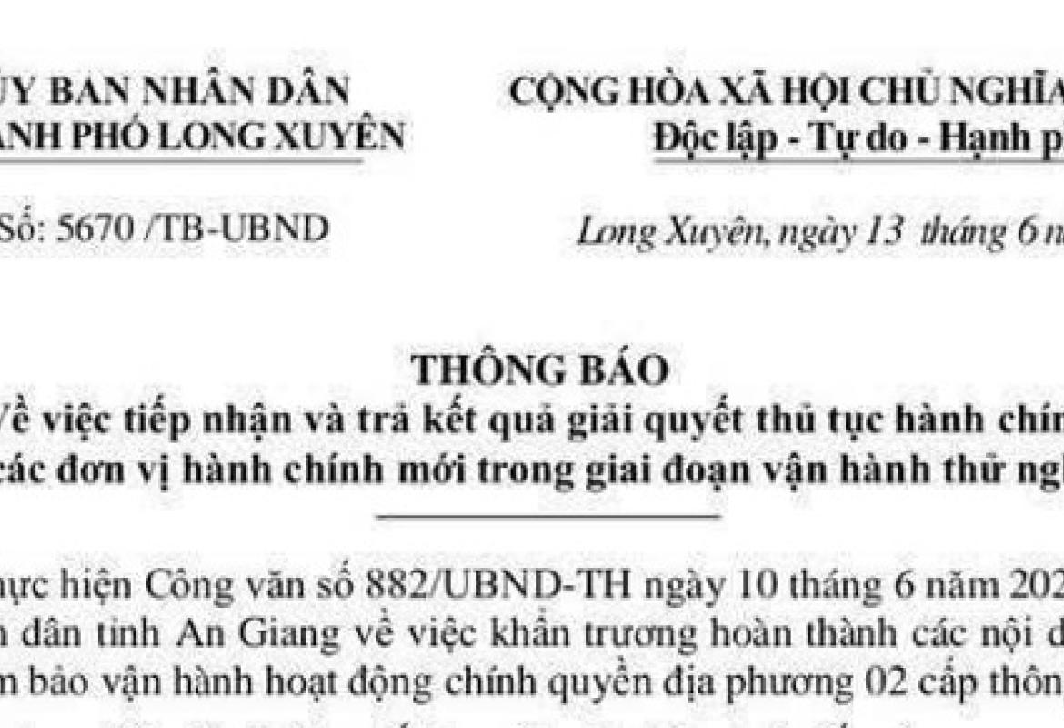 UBND thành phố Long Xuyên ban hành thông báo số 5670/TB-UBND, ngày 13/6/2025 về việc tiếp nhận và trả kết quả giải quyết thủ tục hành chính tại các đơn vị hành chính mới trong giai đoạn vận hành thử nghiệm