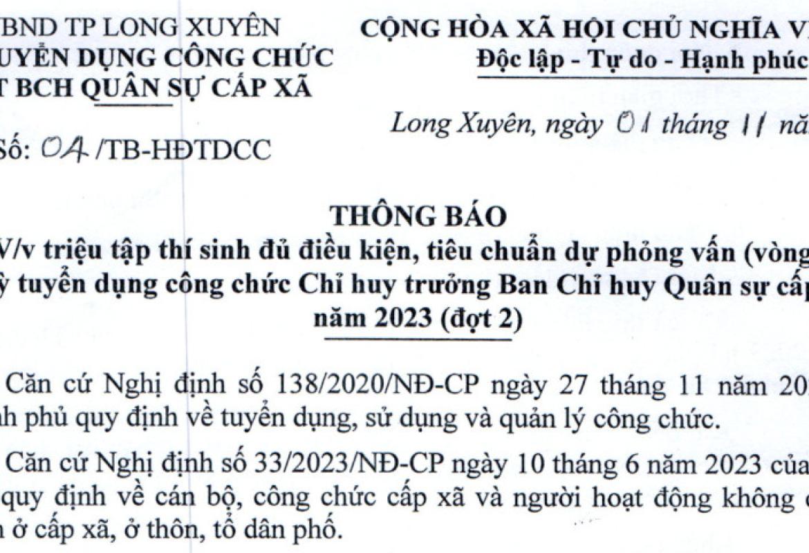 THÔNG BÁO V/v triệu tập thí sinh đủ điều kiện, tiêu chuẩn dự phỏng vấn (vòng 2) kỳ tuyển dụng công chức Chỉ huy trưởng Ban Chỉ huy Quân sự cấp xã năm 2023 (đợt 2)