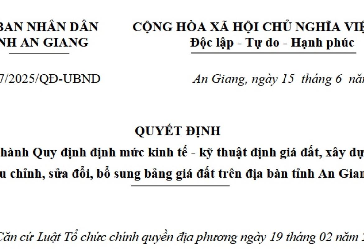 Ủy ban nhân dân tỉnh An Giang ban hành quyết định số 57/2025/QĐ-UBND, ngày 15/6/2025 Ban hành Quy định định mức kinh tế - kỹ thuật định giá đất, xây dựng, điều chỉnh, sửa đổi, bổ sung bảng giá đất trên địa bàn