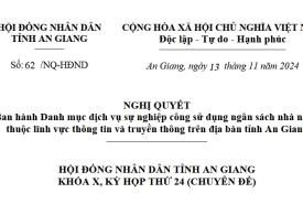 Hội đồng nhân dân tỉnh An Giang Xuyên ban hành Nghị Quyết số 62/NQ-HĐND, ngày 13/11/2024 Ban hành Danh mục dịch vụ sự nghiệp công sử dụng ngân sách nhà nước thuộc lĩnh vực thông tin và truyền thông trên địa bàn tỉnh An Giang