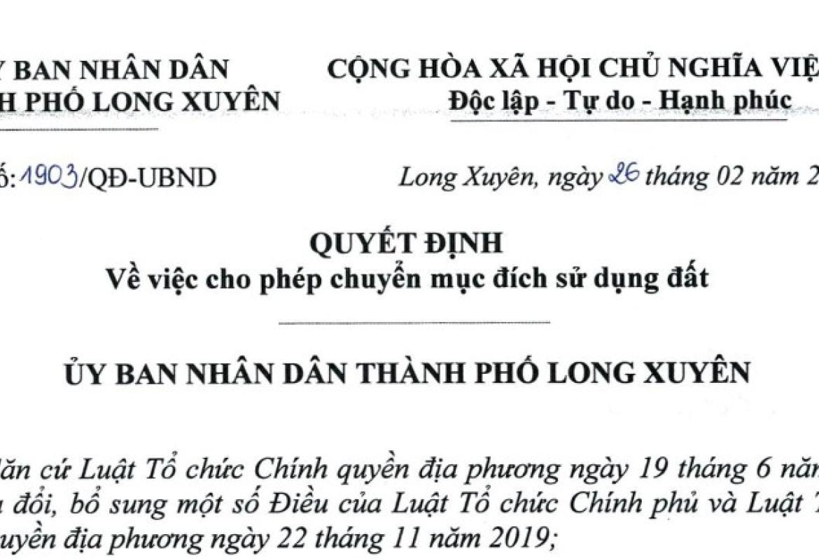 Ủy ban nhân dân thành phố Long Xuyên ban hành quyết định số 1903/QĐ-UBND, ngày 26/02/2025 về việc cho phép chuyển mục đích sử dụng đất