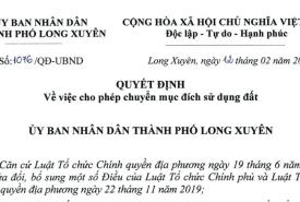 Ủy ban nhân dân thành phố Long Xuyên ban hành quyết định số 1076/QĐ-UBND, ngày 12/02/2025 về việc cho phép chuyển mục đích sử dụng đất cho ông Huỳnh Văn Trim và bà Phạm Thị Hạnh...