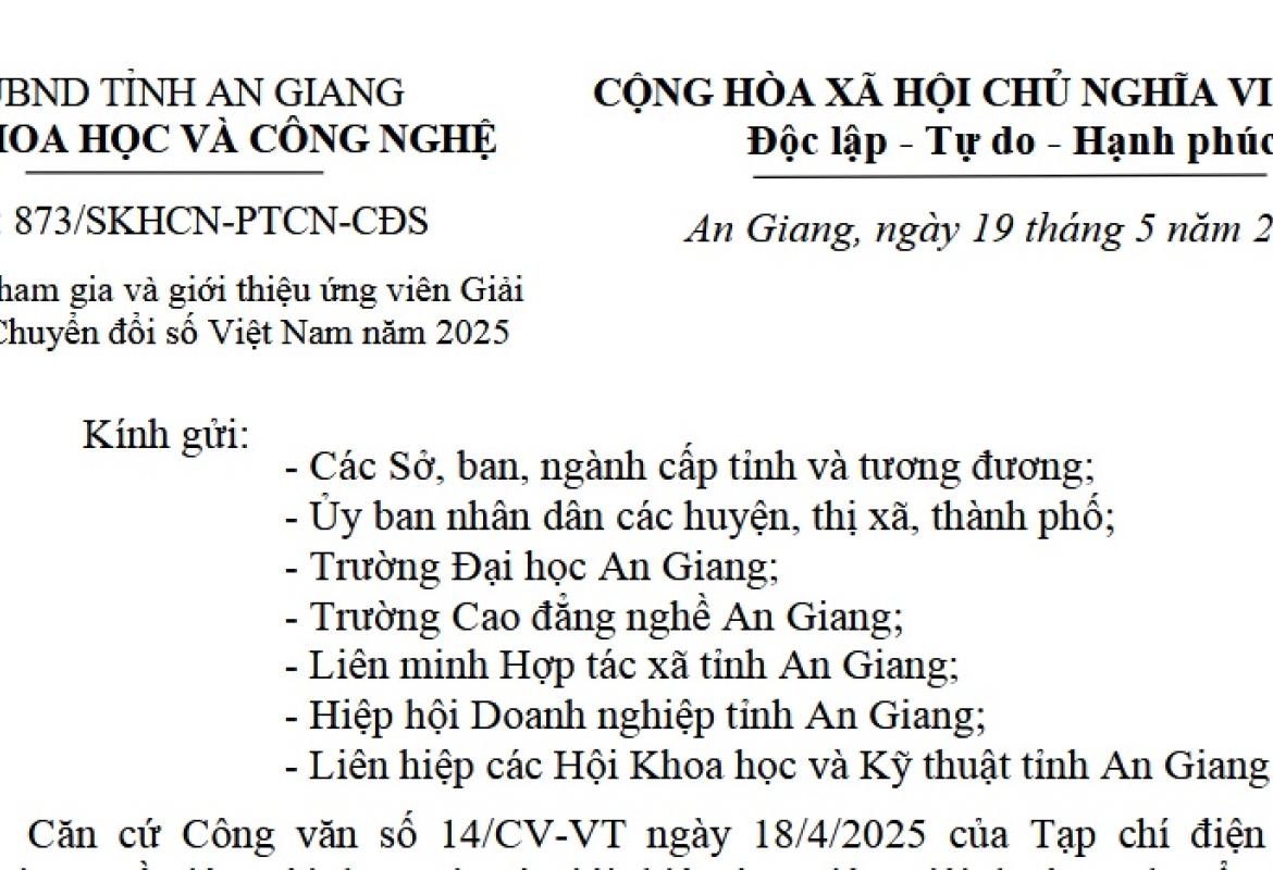 Sở Khoa học và Công nghệ tỉnh An Giang ban hành Công văn số 873/SKHCN-PTCN-CĐS, ngày 19/5/2025 về việc mời tham gia và giới thiệu ứng viên Giải thưởng Chuyển đổi số Việt Nam năm 2025