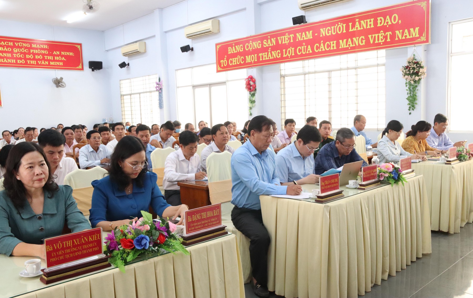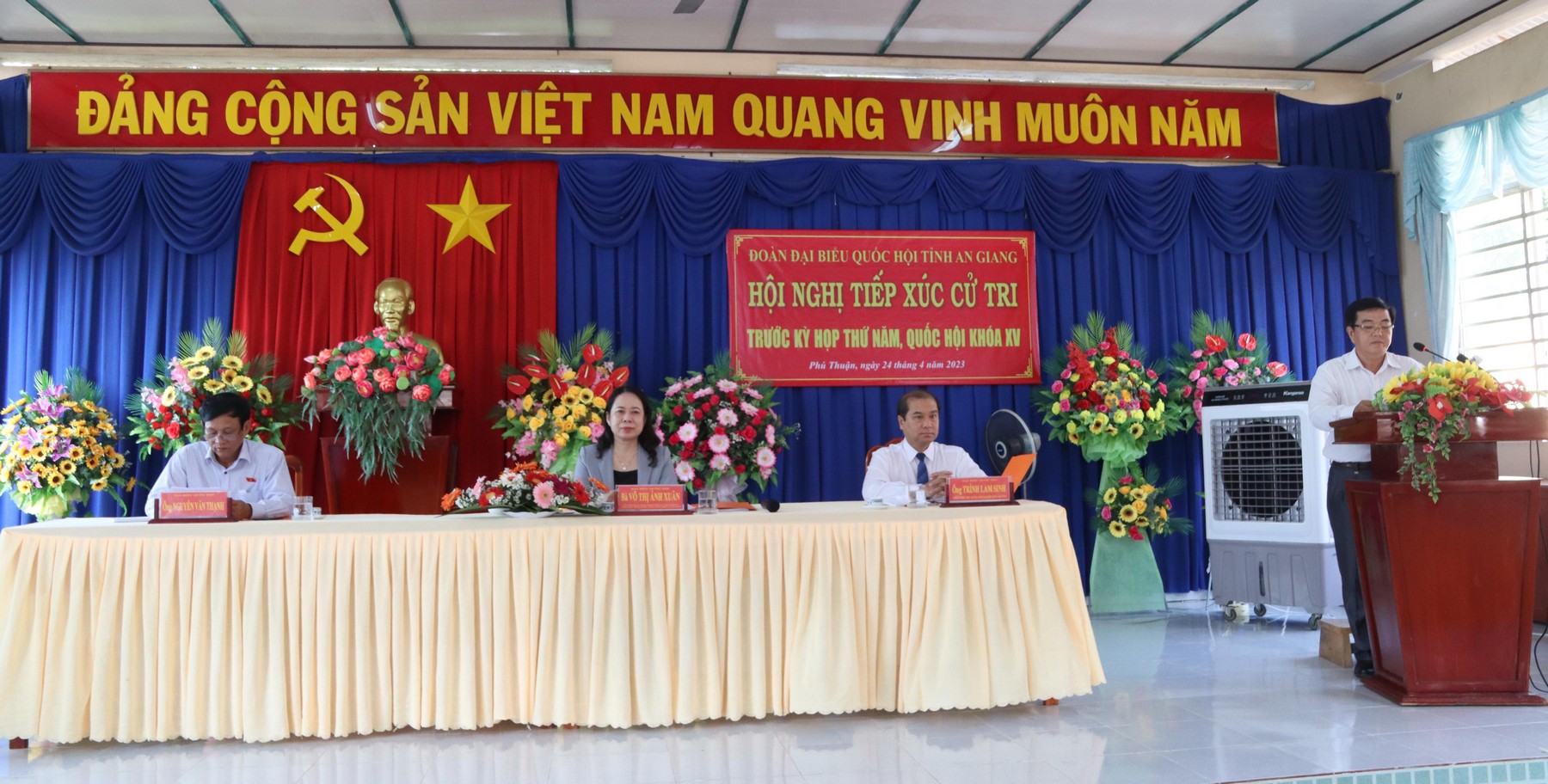 (Cổng TTĐT tỉnh AG)- Ngày 24/4, Đại biểu Quốc hội (ĐBQH) Võ Thị Ánh Xuân, Phó Chủ tịch nước Cộng hòa XHCN Việt Nam; Phó trưởng Đoàn ĐBQH tỉnh An Giang Trình Lam Sinh; ĐBQH Nguyễn Văn Thạnh tiếp xúc cử tri xã Phú Thuận, Vĩnh Chánh, Vĩnh Khánh, thị trấn Phú Hòa (huyện Thoại Sơn); phường Bình Đức, Bình Khánh, xã Mỹ Khánh, Mỹ Hòa Hưng (thành phố Long Xuyên) trước kỳ họp thứ 5, Quốc hội khóa XV.