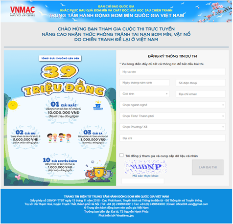 Cuộc thi trực tuyến “Nâng cao nhận thức phòng tránh tai nạn bom mìn vật nổ sau chiến tranh ở Việt Nam” hưởng ứng Ngày Quốc tế nhận thức bom mìn và hỗ trợ hành động bom mìn 04/4/2026 trên phạm vi toàn quốc, nhằm nâng cao nhận thức, thay đổi hành vi cho cộng đồng, góp phần giảm thiểu tai nạn bom mìn vật nổ, bảo vệ tính mạng và sức khỏe của người dân, giúp người dân sống an toàn, tái thiết và phát triển kinh tế ở các khu vực bị ảnh hưởng bởi bom mìn vật nổ, góp phần giảm thiểu tối đa các vụ tai nạn thương tâm do thiếu hiểu biết về bom mìn vật nổ tại địa phương.