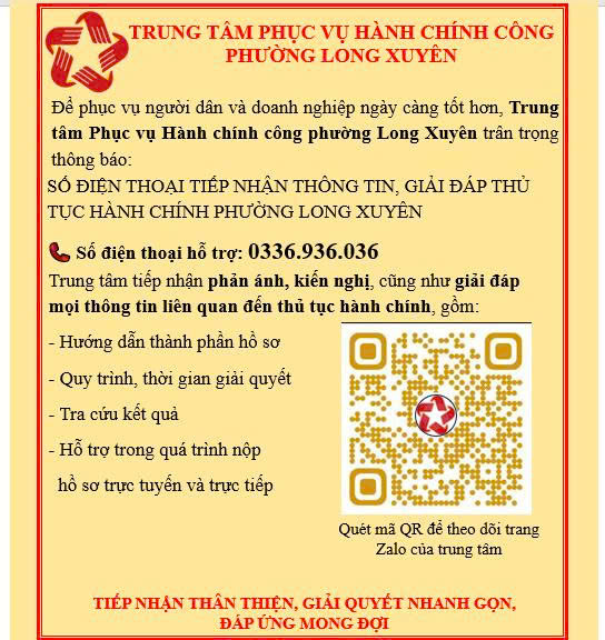 Trung tâm Phục vụ hành chính công phường Long Xuyên công khai số điện thoại và Trang Zalo OA thực hiện tiếp nhận thông tin và giải đáp thủ tục hành chính