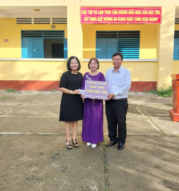 Tại buổi lễ, bà Nguyễn Thị Mỹ Linh, Chủ tịch Hội Doanh nhân trẻ An Giang đã trao số tiền gần 7 triệu đồng cho Ban giám hiệu trường THCS Bùi Hữu Nghĩa để hỗ trợ mua 20 thẻ BHYT, mỗi thẻ có giá trị sử dụng từ 6 tháng, cho các em học sinh có hoàn cảnh khó khăn của trường chưa tham gia BHYT.